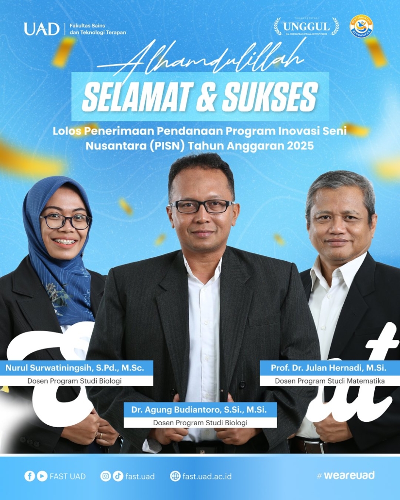 Tim dosen dari Fakultas Sains dan Teknologi Terapan (FAST) Universitas Ahmad Dahlan berhasil lolos pendanaan Program Inovasi Seni Nusantara (PISN) 2025 dengan karya berjudul Batik Fraktal Biologi. Karya ini menghadirkan inovasi unik yang memadukan konsep matematika fraktal dengan pola alami biologi, menciptakan perpaduan harmonis antara seni, ilmu pengetahuan, dan teknologi.